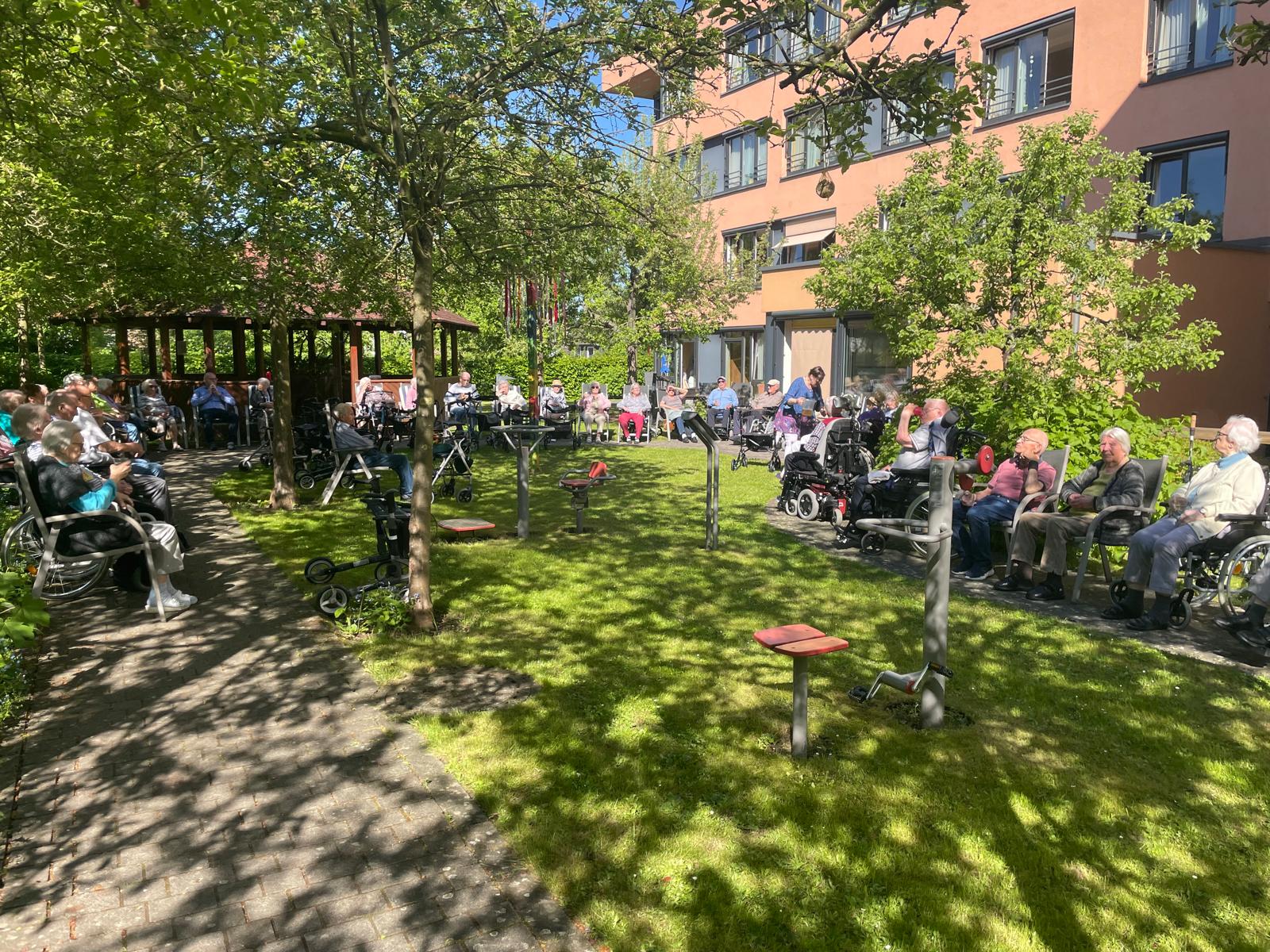 Unsere Alltagsbegleiter*innen versammelten viele Bewohner im hinteren Gartenbereich. Bei Musik und Erfrischungsgetränken verbrachten alle gemeinsamen einen vergnüglichen Vormittag.